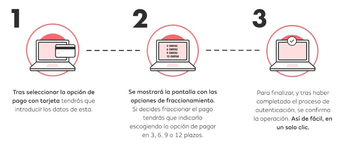 Si tu entidad bancaria está adherida al servicio, podrás fraccionar tus compras de más de 60€ en 3, 6, ó 12 meses, aplicando las condiciones que tengas establecidas en el contrato con la entidad bancaria de tu tarjeta.